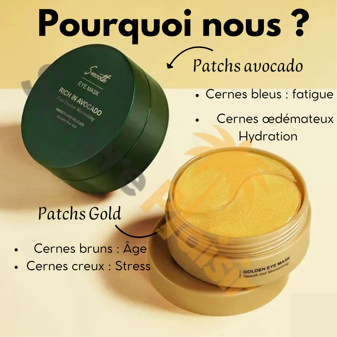 Nos patchs sont conçus pour traiter différents types de cernes. Le pot avocado se concentre sur les cernes bleus et œdémateux, tandis que le Gold cible les cernes bruns et creux.